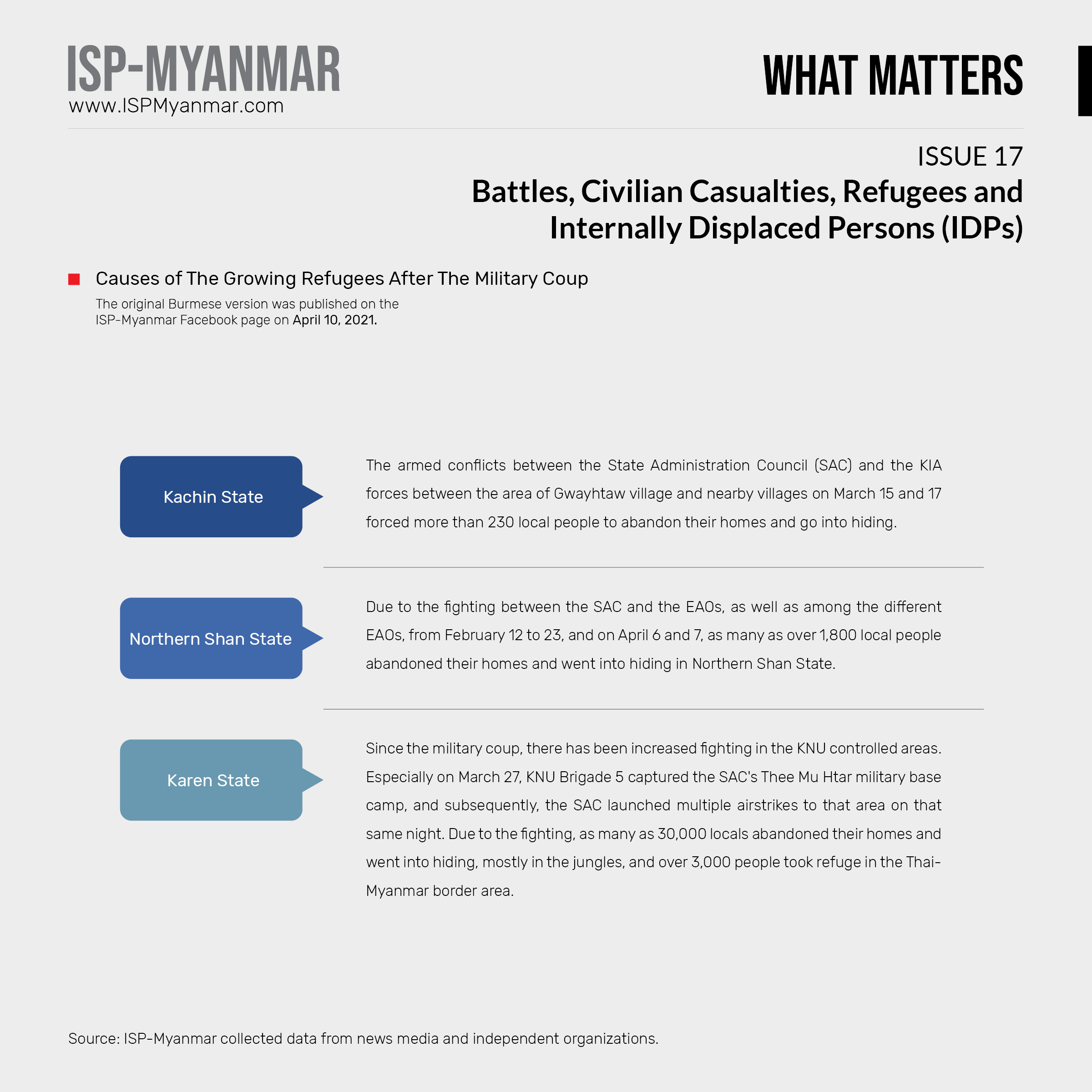 Over two months of conflicts in the ethnic regions, more than 51 civilians died, and over 71 civilians were injured. Among the death toll, 20 of them were killed by the airstrikes of the Myanmar coup military. There has been an increase of 32,030 IDPs due to the conflicts after the military coup. Starting from 2020 to the end of April first week of 2021, the refugee numbers have reached 399,530. Over the new 30,000 IDPs were in Kayin State (Karen State). Among them, only about 3,000 went to the Thai-Myanmar border for hiding, whereas most people went into hiding in the jungles and forest of the KNU controlled areas.
