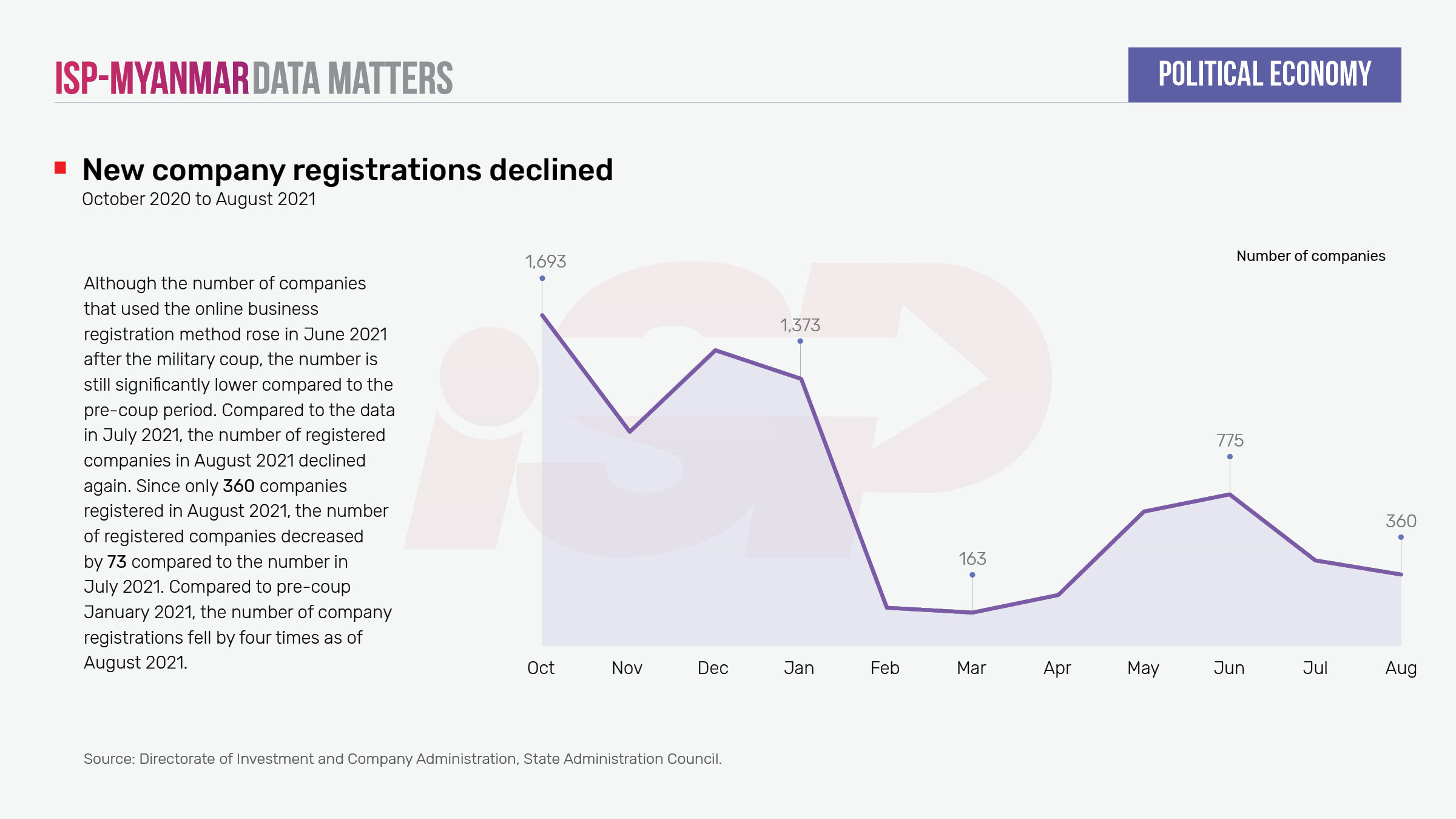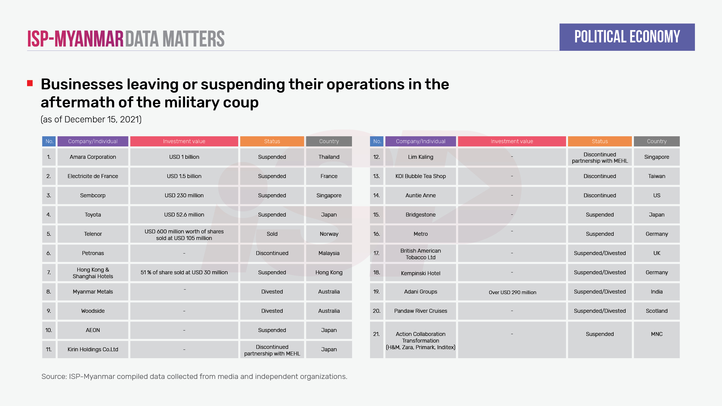More than 20 world-famous clothing companies, including multinational corporations such as H&M from Sweden, Inditex from Spain, and Primark from Britain, recently decided to suspend their operations in the garment industry in Myanmar. Since the military coup, the number of foreign-invested businesses leaving Myanmar has risen to 21. These include businesses in the infrastructure sector, which has the highest amount of foreign investment. In addition, the number of companies that used the onlinebusiness registration method has also continued to decline. Since the number of registered companies in August 2021 was only 360, the number decreased by 73 compared to registrations in July 2021. Compared to the time before the coup in January 2021, the number of company registrations declined by almost four times in August 2021.
