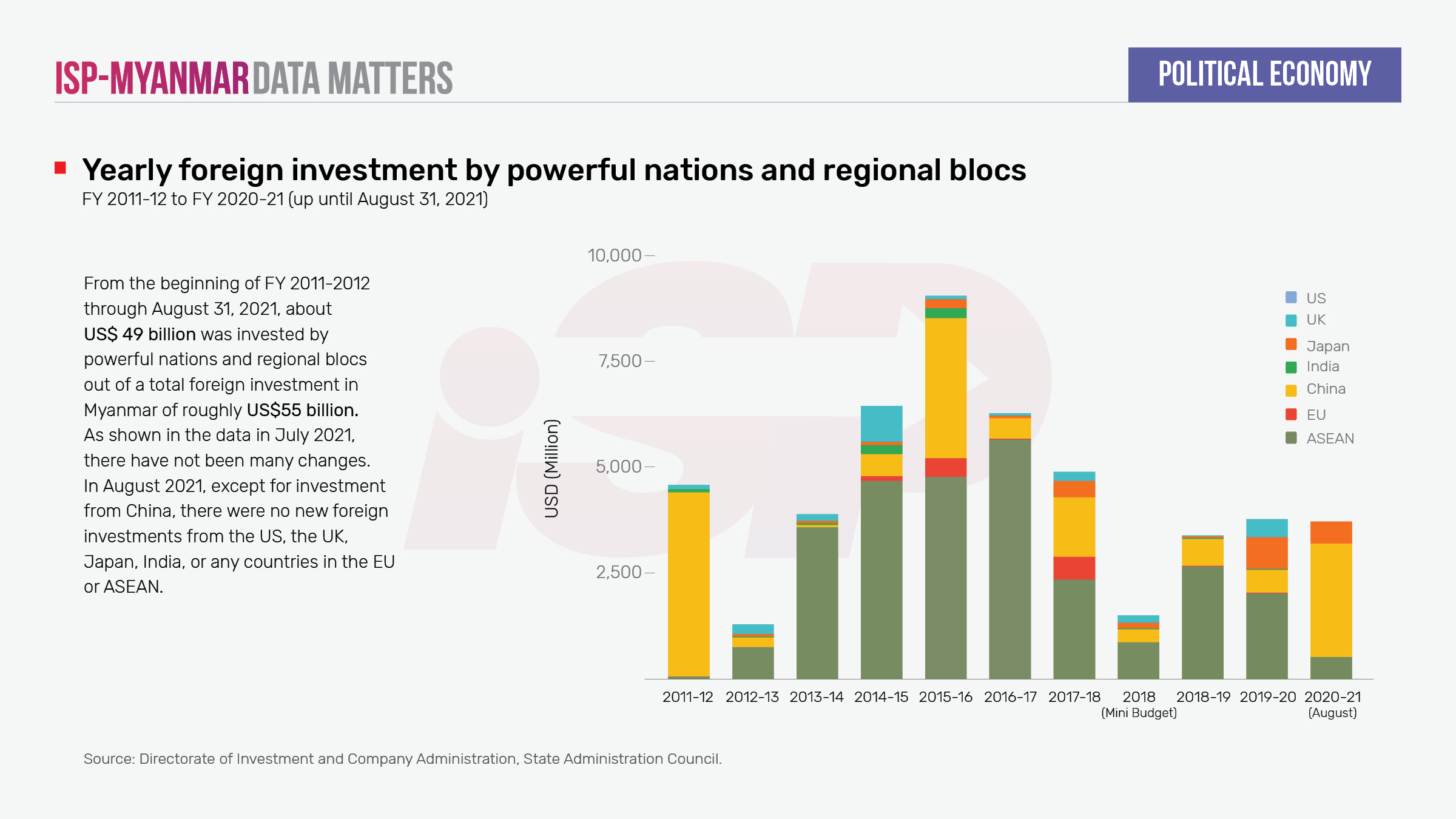 Foreign investment is an important economic pillar for developing countries, but not all kinds of foreign investment guarantee economic growth. If the investments are resource-exploitative, inconsiderate of the environment, inconsiderate of human rights, and do not improve the livelihoods of the local people, they could further deteriorate the development of the country and cause further impoverishment and vulnerability among Myanmar people. This has been the case throughout successive military regimes in Myanmar. The information concerning which countries are currently investing in Myanmar and what kind of investments are entering the market is key to understanding the involvement of other countries in the current political crisis. Moreover, foreign investments have a direct impact on the long-term sustainable development of the country and the livelihoods of Myanmar people, so it is crucial to monitor any foreign investment developments. Particularly in the current situation in which information ecosystems are being corrupted and destroyed, it is important to keep track of the figures on foreign investment to check whether the military regime is being transparent in their reporting of investments they have approved.