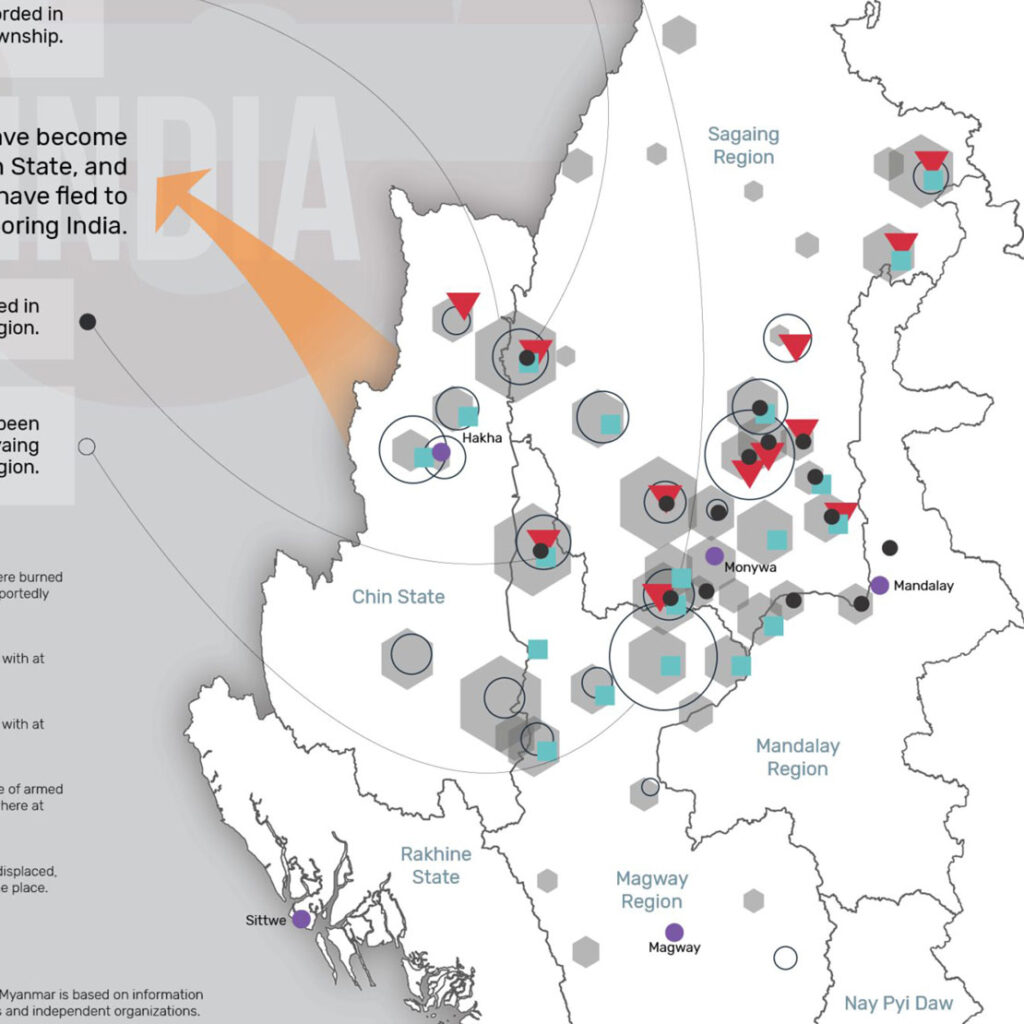 Of all Myanmar’s regions, the Karenni Region, which includes Kayah State and southern Shan State’s Pekon Township, has become one of the regions that has experienced some of the most sustained armed resistance to the post-coup military regime. There were at least 247 skirmishes and 123 military airstrikes. ISP-Myanmar Mapping shows the main areas of conflict in the Karenni region, locations of the clashes, where military airstrikes were conducted and houses burned down, as well as locations where the civilians were killed and highlights the areas and totals of internally displaced citizens. This data is based on information obtained between from May 21, 2021 and to April 30, 2022.