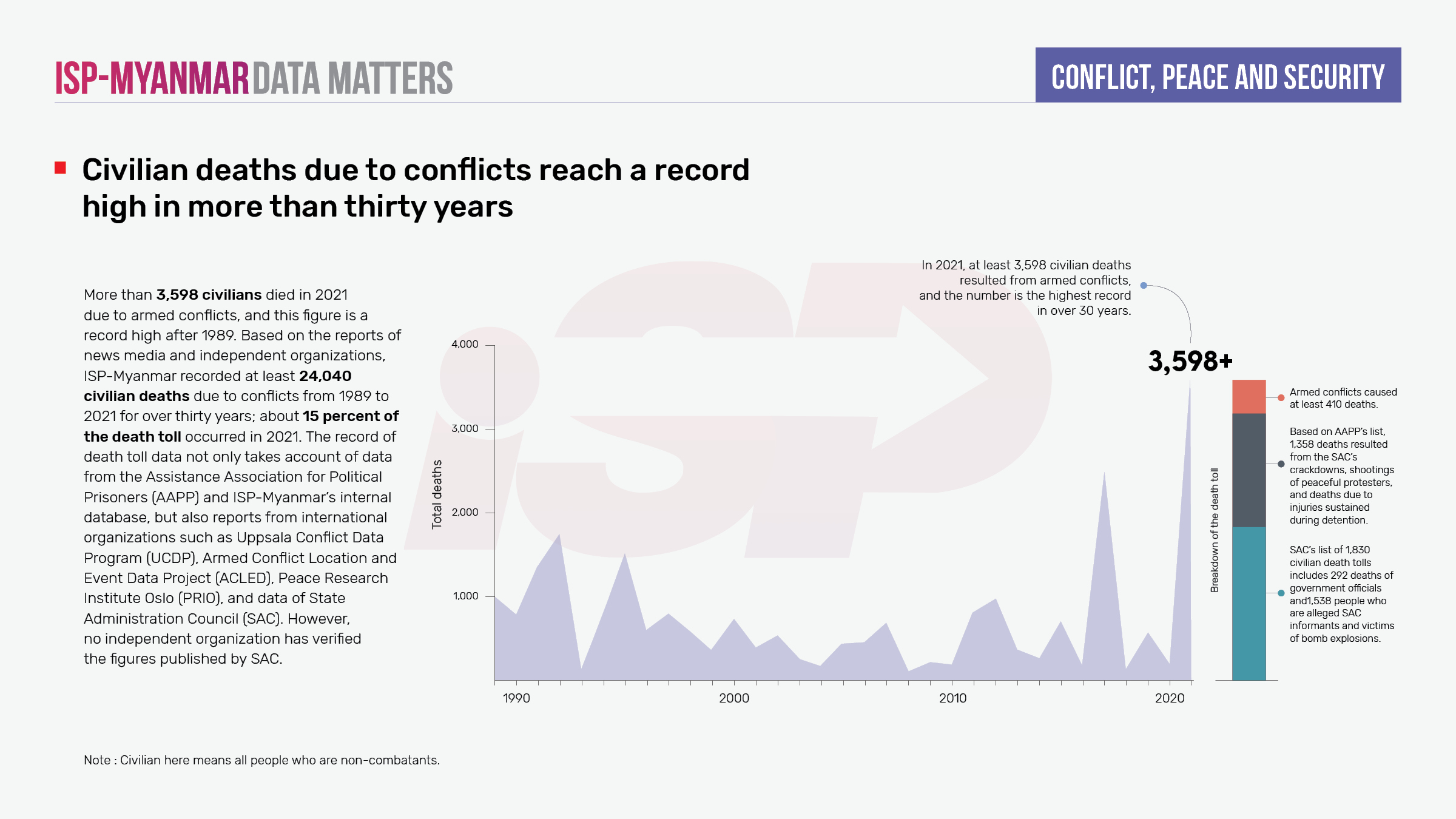In 2021, there were at least 3,598 deaths caused by the political and military conflict in Myanmar following the military coup, the highest on record in over 30 years since 1989. According to data compiled by ISP-Myanmar based on publications by media and independent organizations, at least 24,040 civilians have died from 1989 to 2021, with 15 percent of this death toll occurring in 2021 alone.