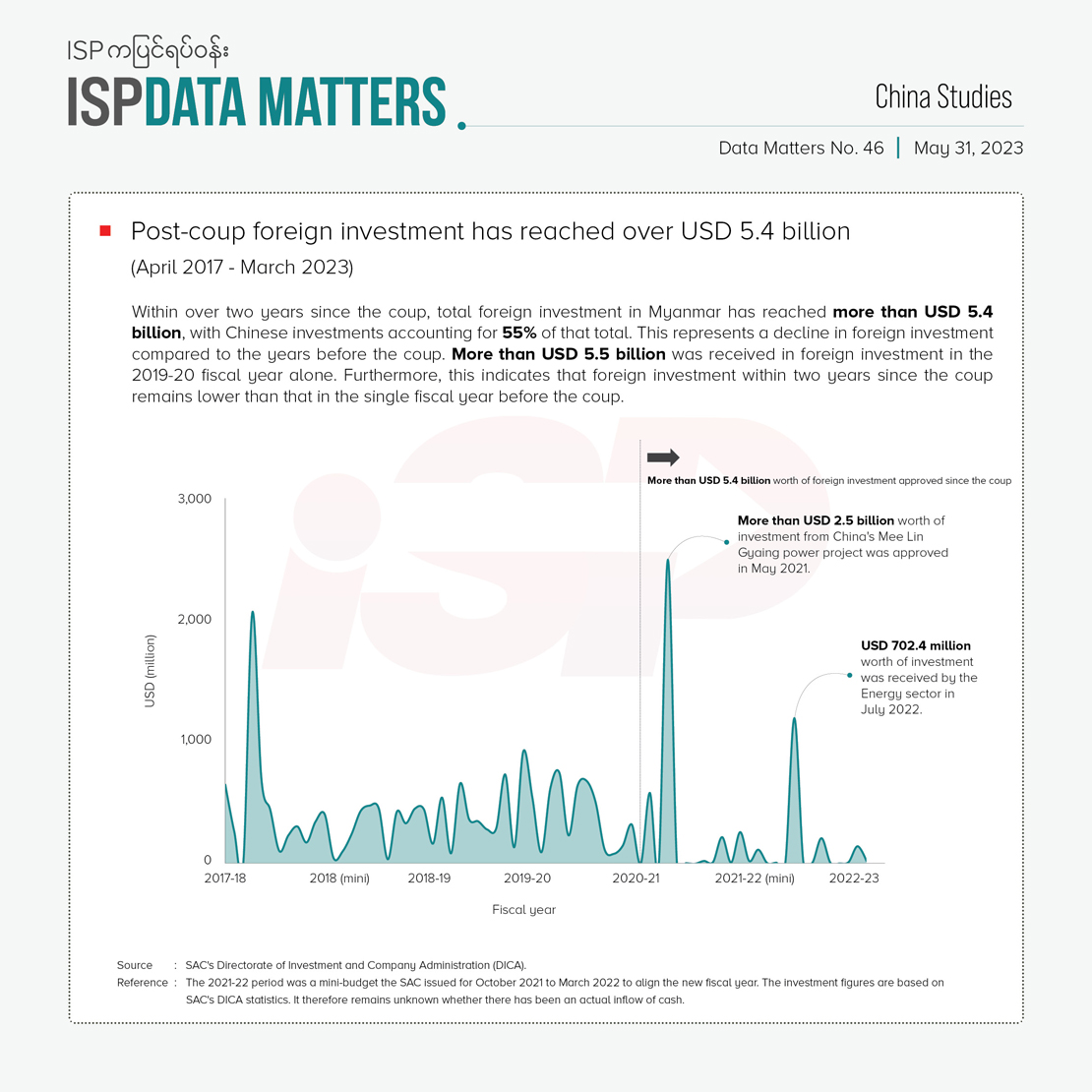 Myanmar has attracted more than USD 5.4 billion in foreign investment within over two years since the coup. Of these, 70 percent (approximately USD 4 billion) is directed to the energy sector. The extent of foreign investment in the energy sector includes USD 2.5 billion – part of China’s Mee Lin Gyaing LNG Power project, which was approved in May 2021. Additionally, over USD 700 million was invested in the energy sector in July 2022. The identity of the investor(s) is currently unknown. Overall, foreign investments have declined since the coup. During the 2019- 20 fiscal year before the coup, foreign investment exceeded USD 5.5 billion. The combined value of foreign investments in the two fiscal years following the coup remains lower than the total value of the investments made in the year prior to the coup.