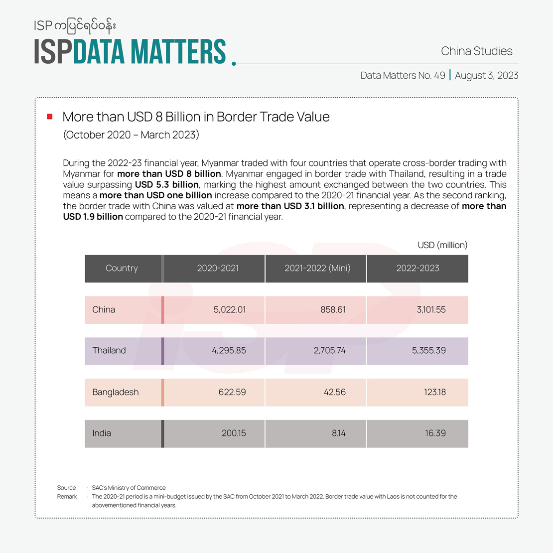 A comparison between the statements of SAC and the General Administration of Customs of China (GACC) shows a nearly USD 17 billion gap in the previous 2022-23 financial year. The amount represents illegal trade while showing an increase of almost two times compared to the 2020-21 financial year. As a result, the enlarging gap between Myanmar and China for different financial years indicates a growing amount of illegal trade volume between the two countries in the aftermath of the coup. Except for Thailand, Myanmar is experiencing a decline in trade with three of the four neighbouring countries with cross-border trade routes. China still ranks as the biggest trade partner.