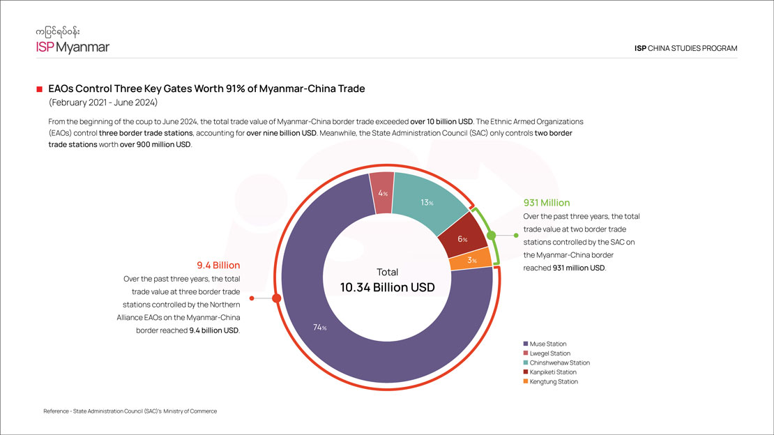 A year after Operation 1027, the 3BHA and KIA gained control of key Myanmar-China border trade gates, enhancing their geopolitical leverage. That means these groups hold control over territories advantageous for long-term war dividends, other economic interests, and geopolitical influence. EAOs have gained control of three out of five national-level Myanmar-China border trade stations.