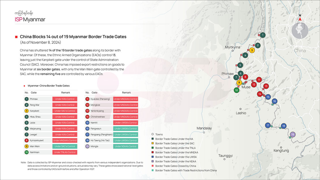 As Nan Lwin noted, China aims to weaken the military strength of EAOs that do not follow its wishes by setting the “Five Cuts”—cutting off electricity, water, internet, supply chains, and personnel. Border gate closures and trade restrictions have nearly halted trade at all Myanmar-China border gates.