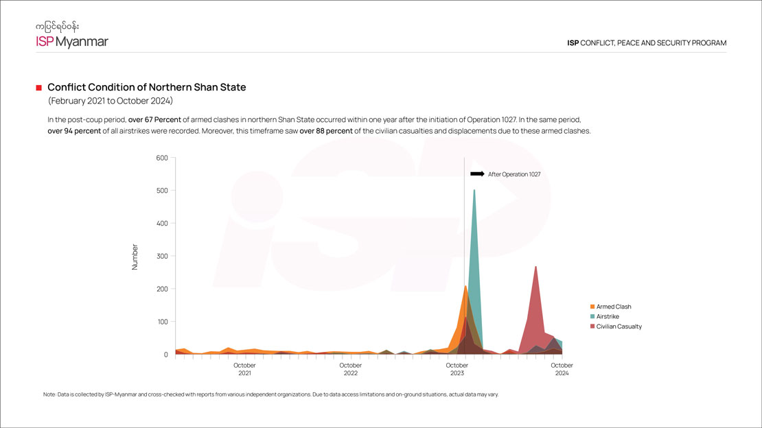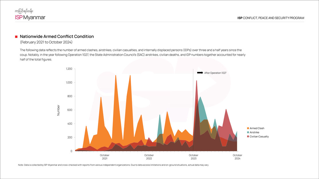 Despite China’s pressure and sanctions, the allied forces continue to launch offensives throughout the Mandalay region. As you can see in this graph, it’s evident that conflicts and armed clashes are still widespread nationwide.