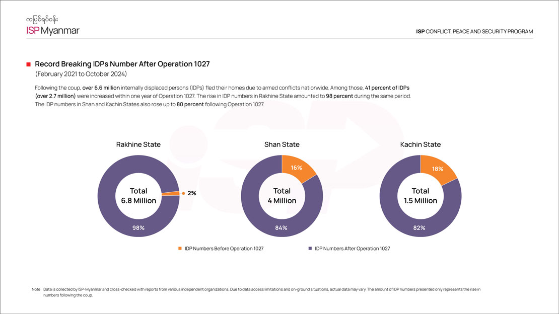 Civilians in this region mostly suffered from these strikes. As shown here, after Operation 1027, the number of clashes, airstrikes, and civilian casualties in northern Shan State has increased in folds. The number of internally displaced persons (IDPs) has also grown tenfold following the operation, even within northern Shan State alone. Before Operation 1027, there were around 18,000 IDPs in northern Shan State. Now, it has risen to 220,000 IDPs. Kaung San discussed how China’s sanctions impacted the daily lives of ordinary people. The people are suffering through a double whammy of war and oppression, enduring the double troubles.