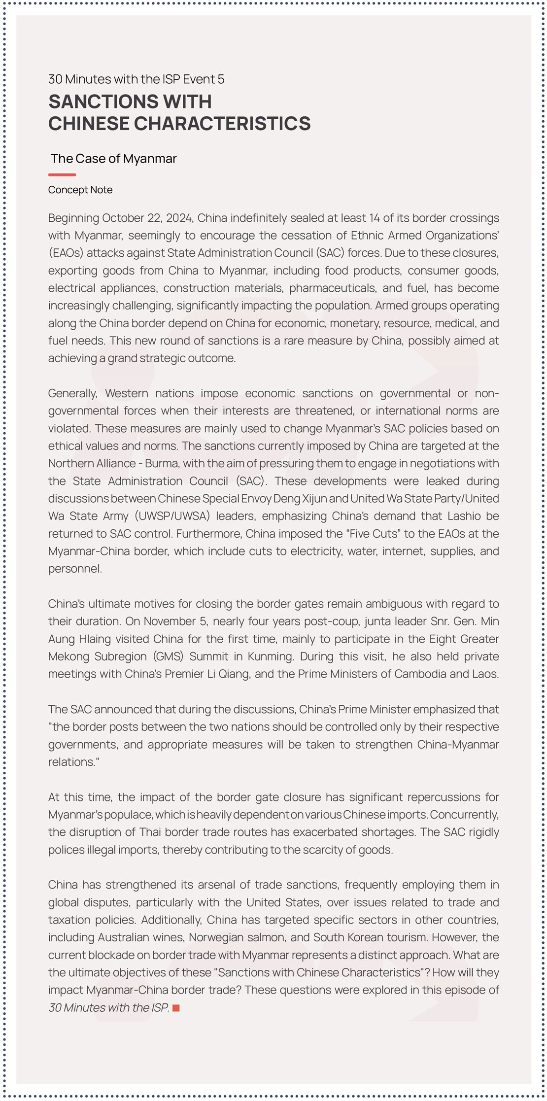 The recap memo of the 30 Minutes with the ISP live event discussing China’s sanctions on Myanmar and their impacts.