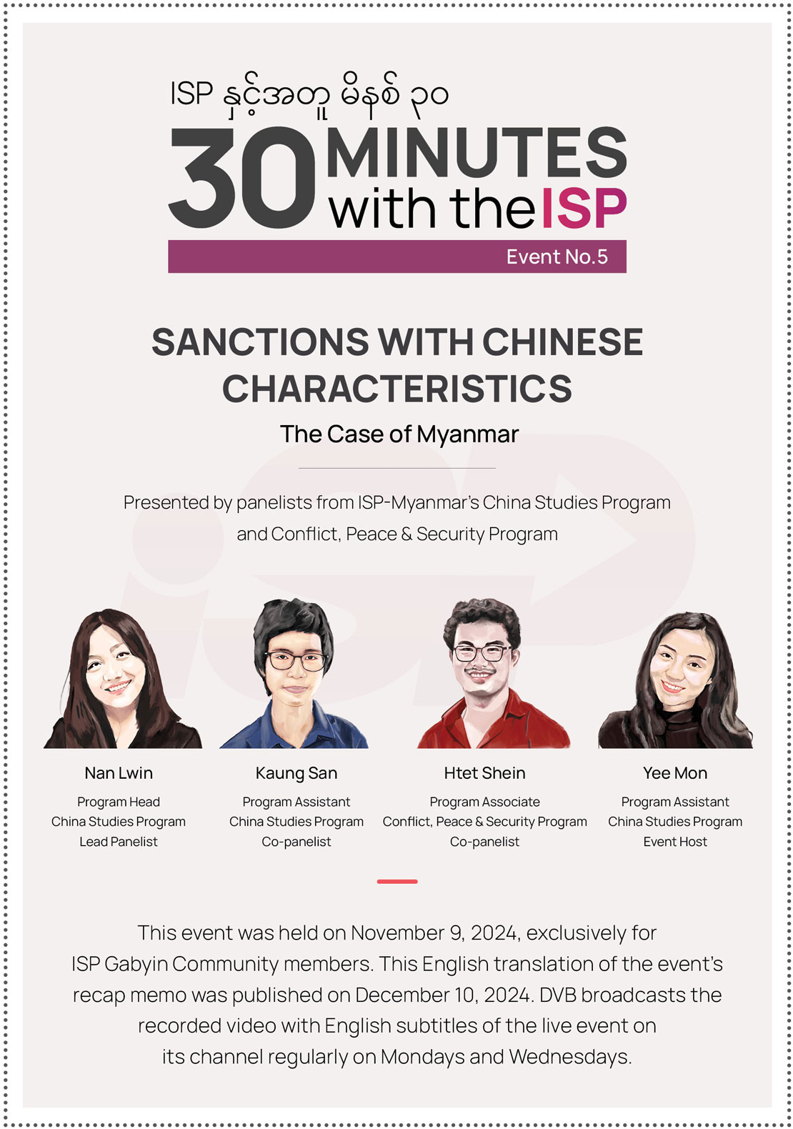 Event No. 5 of the "30 Minutes with ISP" series was held on November 9, 2024, exploring "Sanctions with Chinese Characteristics: The Case of Myanmar."