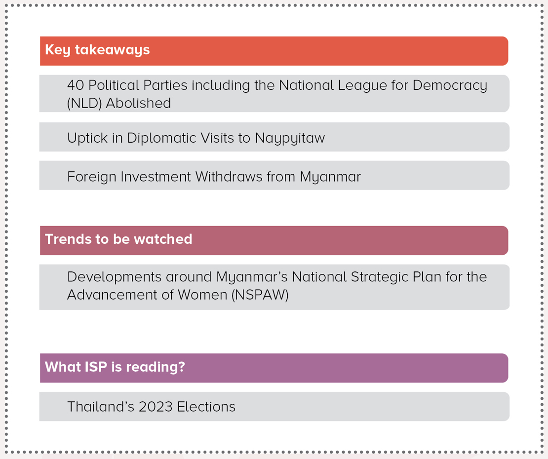 ISP-Myanmar conveys well wishes for a safe and productive New Year for Myanmar Era 1385 and a happy Thingyan festival to Gabyin community members. In this Insight Email, ISP-Myanmar reports the legal abolition of 40 political parties, including the National League for Democracy (NLD), examines the increase in diplomatic expeditions to Naypyitaw, and assesses the withdrawal of foreign investment from Myanmar. This email also discusses Myanmar’s National Strategic Plan for the Advancement of Women (NSPAW) and developments surrounding the upcoming Thai elections.