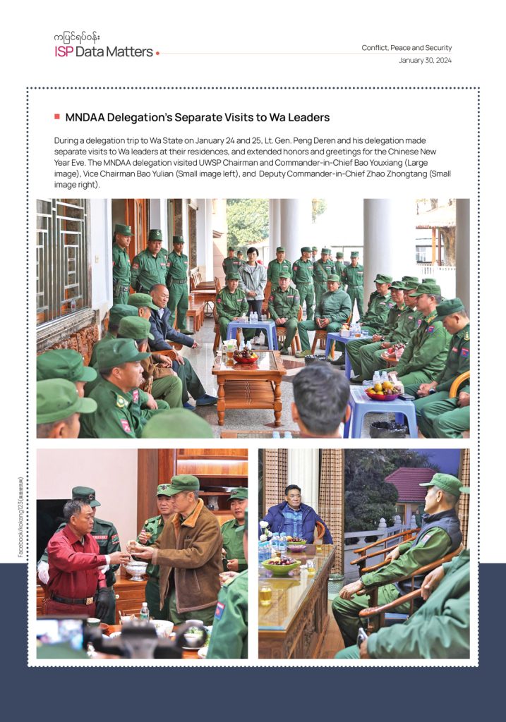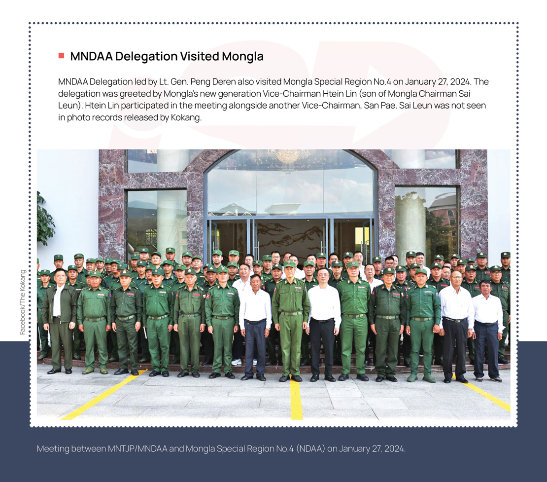 The visits coincided with the third month anniversary of Operation 1027 as well as the total takeover of Laukkai, the main warfare objective accomplished by the MNDAA before the memorial date of the passing of former Kokang leader Peng Jiasheng in February. The meeting was portrayed as Chinese New Year Eve visits, highlighting the maintenance and renewal of friendship ties developed by former leaders. An intriguing aspect of the trips was the emergence of new youth leadership faces.
