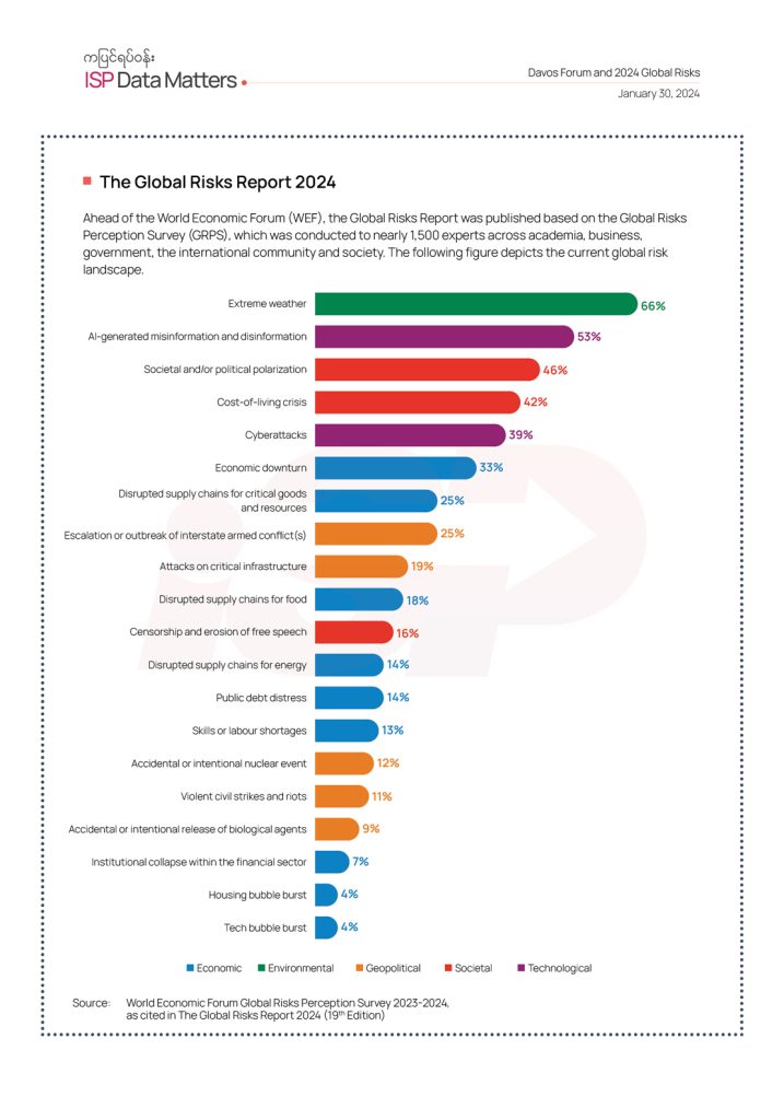 Following “The Rise of Princelings” analysis, the “Trends to Watch” section discusses inflation in Myanmar. Lastly, the “What ISP is Reading” section focuses on the developments from the Davos World Economic Forum (WEF) including the Thai Foreign Minister’s policy speech on Myanmar and a discussion on the WEF Global Risks Report 2024.