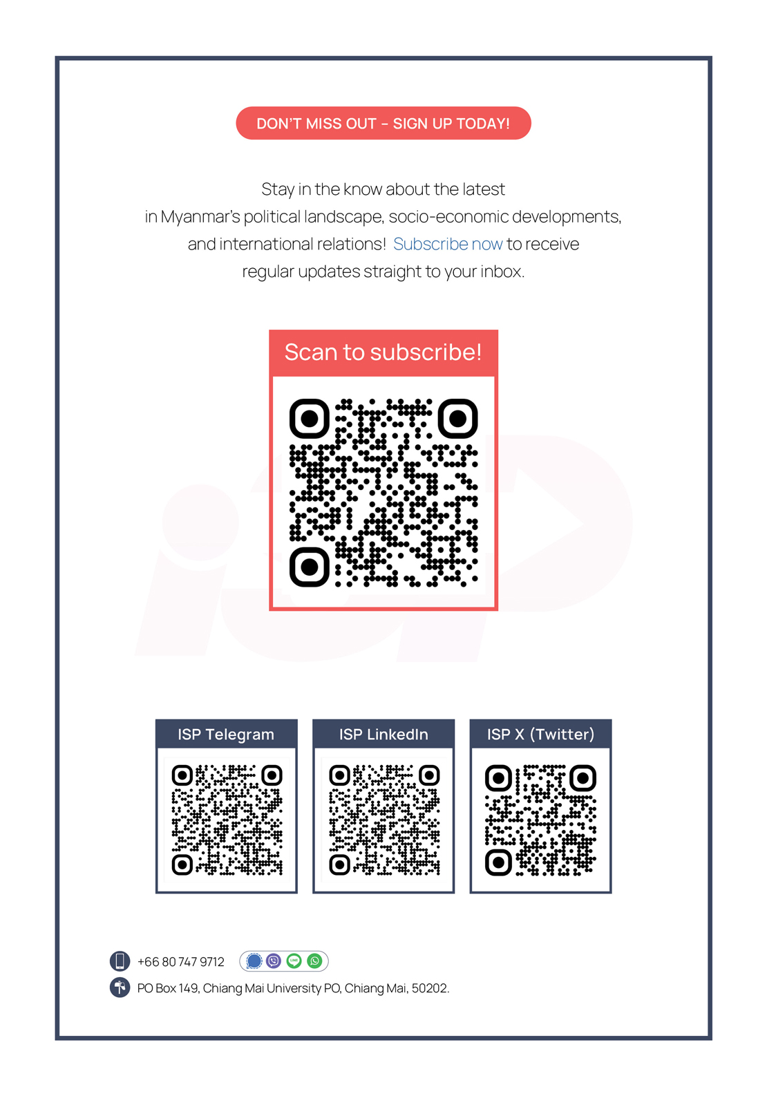Passing the torch in leadership to a new generation can lead to differing viewpoints and new strategies. The newer generation is naturally inclined to take creative risks instead of muddling in the same status quo. As the younger generation witnesses the fruits of their endeavors, their convictions and determination intensify. ISP-Myanmar sees this as the pride of “Princelings.” Those who do manage to achieve success in all of their effort, particularly in Operation 1027, may glorify the significance of their own convictions by their recent military victories. Under these conditions, conflict de-escalation may be difficult in Myanmar’s conflict landscape. In addition, the lack of existing bonds or connections between current military leaders and the opposing “Princelings” is also significant. Strangers who have never encountered adversity together may find it easy to annihilate the other without hesitation. This dynamic will likely shape the future conflict landscape. This generational leadership transition is a development worth to be closely monitored. ISP-Myanmar will feature this topic again in future publications when relevant.