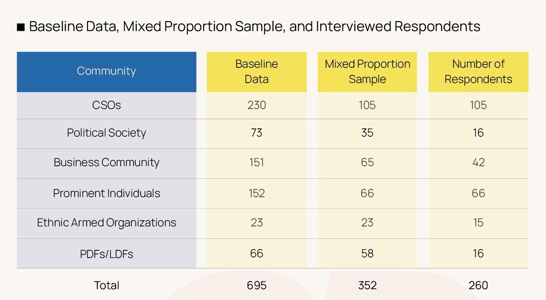 For this survey, the interview sample was selected based on the baseline respondent list, with the number of individuals from each of the six communities calculated proportionately. Our survey research team calculated and stratified the samples from the baseline list. However, the number of respondents representing EAOs and People’s Defense Forces (PDFs/LDFs) were lower than the other four communities. Therefore, to ensure their responses were represented in the survey findings, additional samples from these groups were included based on the baseline data. Consequently, a mixed proportion approach was used to select the individuals for interviews.