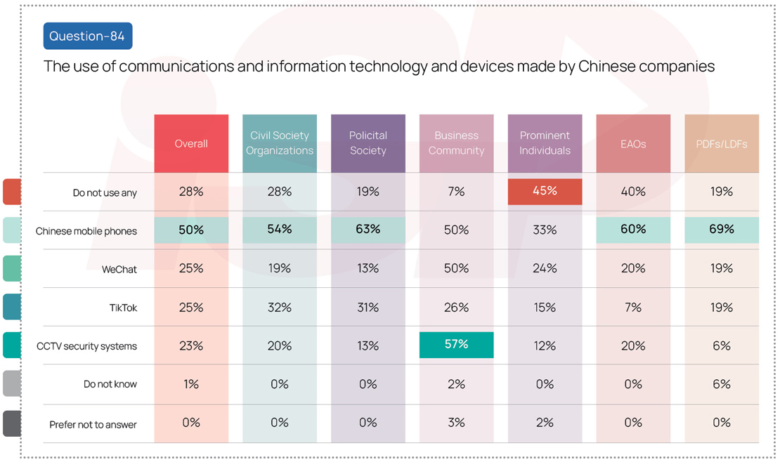 For survey question No. 84, respondents were asked whether they use communications and information technology and devices made by Chinese companies from a given list, with the option to select more than one if applicable.