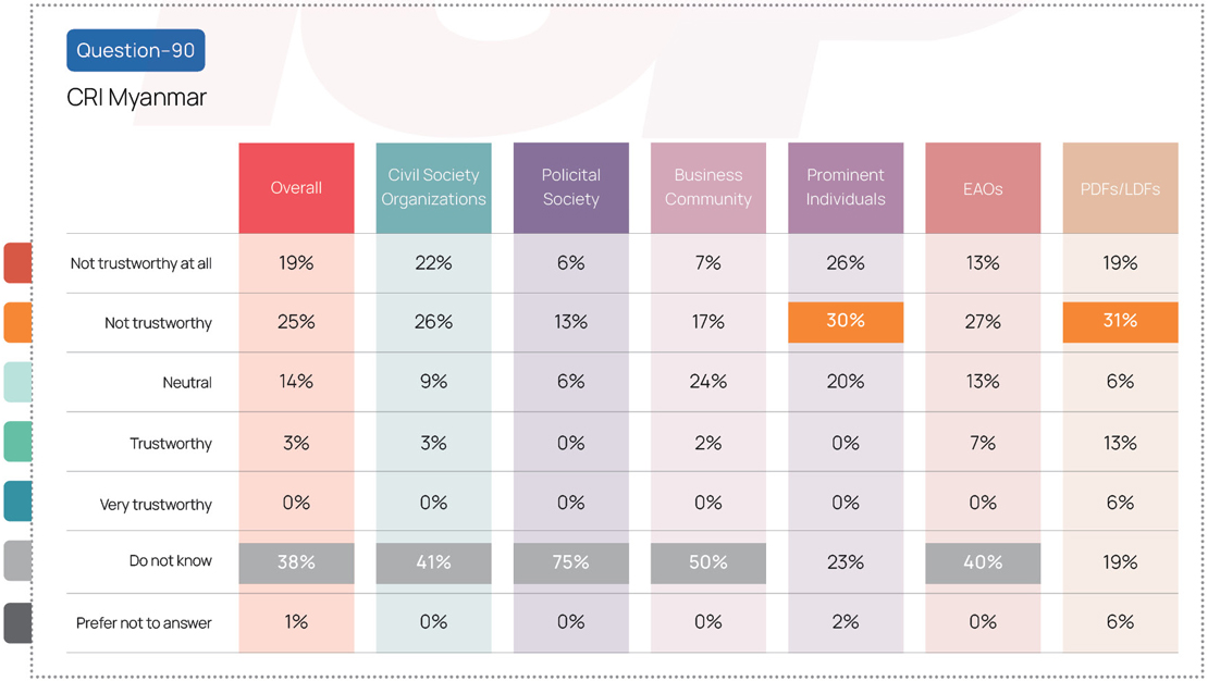 The survey shows limited awareness and widespread distrust of Chinese state-owned media in Burmese language among Myanmar’s key stakeholder groups. Forty-four percent of the political society group reported being unaware of Xinhua Myanmar, while 56 percent of prominent individuals deemed it untrustworthy. Awareness of CRI Myanmar was also low: 75 percent of the political society group, 50 percent of the business community, 41 percent of CSO respondents, and 40 percent of EAOs said they were unfamiliar with it. Similarly, Pauk Phaw was poorly received, with 63 percent of PDFs/LDFs expressing distrust.