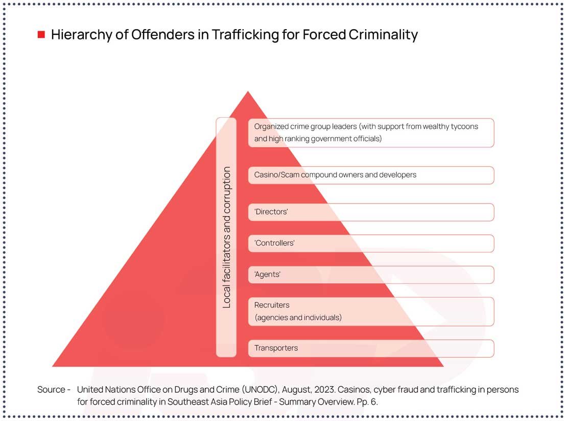 After Operation 1027 in northern Shan, which was partly aimed at eradicating the online scam syndicates, the term “Kyar Phyant” (originally from the Chinese 诈骗) gained widespread use among the public as it began to emerge as a global threat. According to a report in August 2023 by the United Nations Office on Drugs and Crime (UNODC), these scams are increasing and are orchestrated by organized crime groups. Primarily situated in the Mekong region, including countries like Cambodia, Laos, Myanmar, and other ASEAN nations, these scam syndicates are often linked to human trafficking, forced labor, and even slavery. The UNODC has even coined the term “cyber slavery” to describe cases where individuals are abducted and coerced into committing online crimes. The report estimated that hundreds of thousands to millions of people may be forced to participate in these criminal activities, highlighting the horror of how these schemes extract profits. According to the UNODC report, the profits generated from these scams could range from 7.5 to 12.5 billion US dollars. This amount is equivalent to approximately half of the GDP of some small ASEAN countries, highlighting the global nature of the threat.