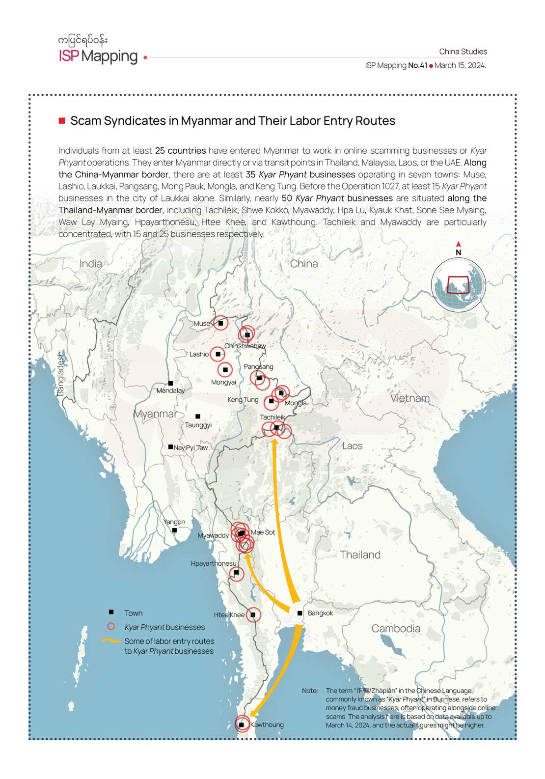 Despite the ongoing efforts to arrest Kyar Phyant operations throughout Myanmar, there remains uncertainty regarding the methods and procedures involved in the arrest and prosecution of Chinese nationals who are leaders of Kyar Phyant gangs. The case of Mr. She Zhijiang, formerly a Chinese citizen, highlights the apparent reluctance or delay on the part of the Chinese government to intervene or provide clarification despite his arrest by Thai authorities more than a year ago. Born in Yunnan Province, She Zhijiang has been involved in the gambling industry across various Southeast Asian countries, including Cambodia, the Philippines, and Myanmar, and involved in the BRI investments. If other Kyar Phyant gang leaders like She remain at large without facing arrest, or if their trials proceed without significant consequences, then the eradication of Kyar Phyant will remain far from complete. Based on the experiences of the Philippines and Indonesia, if Kyar Phyant operations are suppressed in one location, they relocate to another area and continue their illicit activities. Myanmar, Laos, and Cambodia have not reached a conclusive fight againts Kyar Phyant operations. Subsequently, it is imperative to closely monitor the emergence of new bases in border regions and areas lacking a stable rule of law.