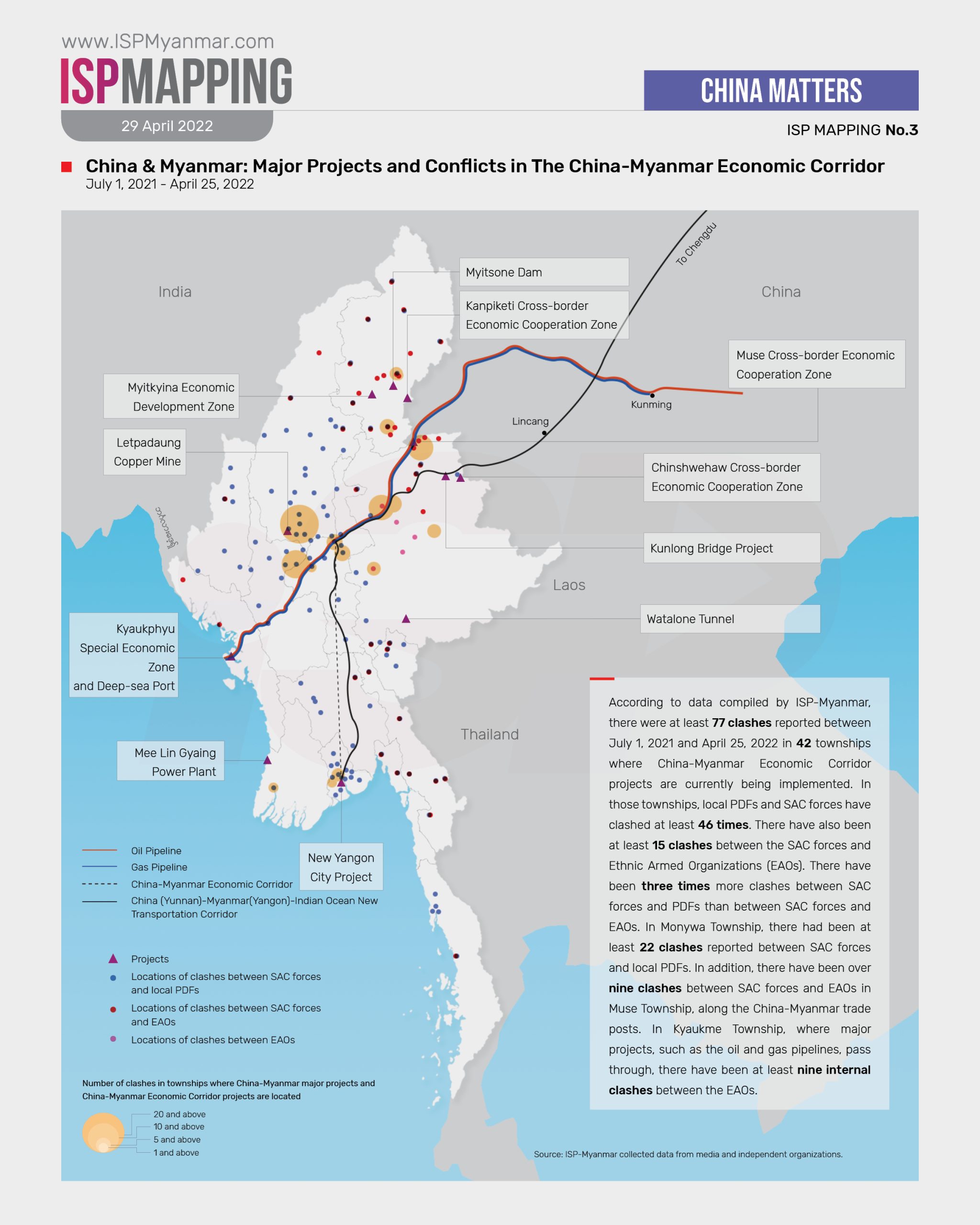 According to data compiled by ISP-Myanmar, there were at least 77 clashes reported between July 1, 2021 and April 25, 2022 in 42 townships where China-Myanmar Economic Corridor projects are currently being implemented. Of that total, 34 clashes occurred between February 4 and April 25, 2022. Local PDFs and SAC forces have clashed at least 46 times in the townships with ongoing China-Myanmar economic projects. There have also been at least 15 clashes between the SAC forces and ethnic minority armed groups (EAOs). There have been three times more clashes between SAC forces and PDFs than between SAC forces and EAOs. Additionally, there have also been 16 internal clashes within the EAOs themselves. In Monywa Township, there had been at least 22 clashes reported between SAC forces and local PDFs. In addition, there have been at least nine clashes between SAC forces and EAOs in Muse Township, along the China-Myanmar trade posts. In Kyaukme Township, where major projects, such as the oil and gas pipeline pass through, there have been at least nine internal clashes between the EAOs. The exact number of these clashes can be observed in the map below.
