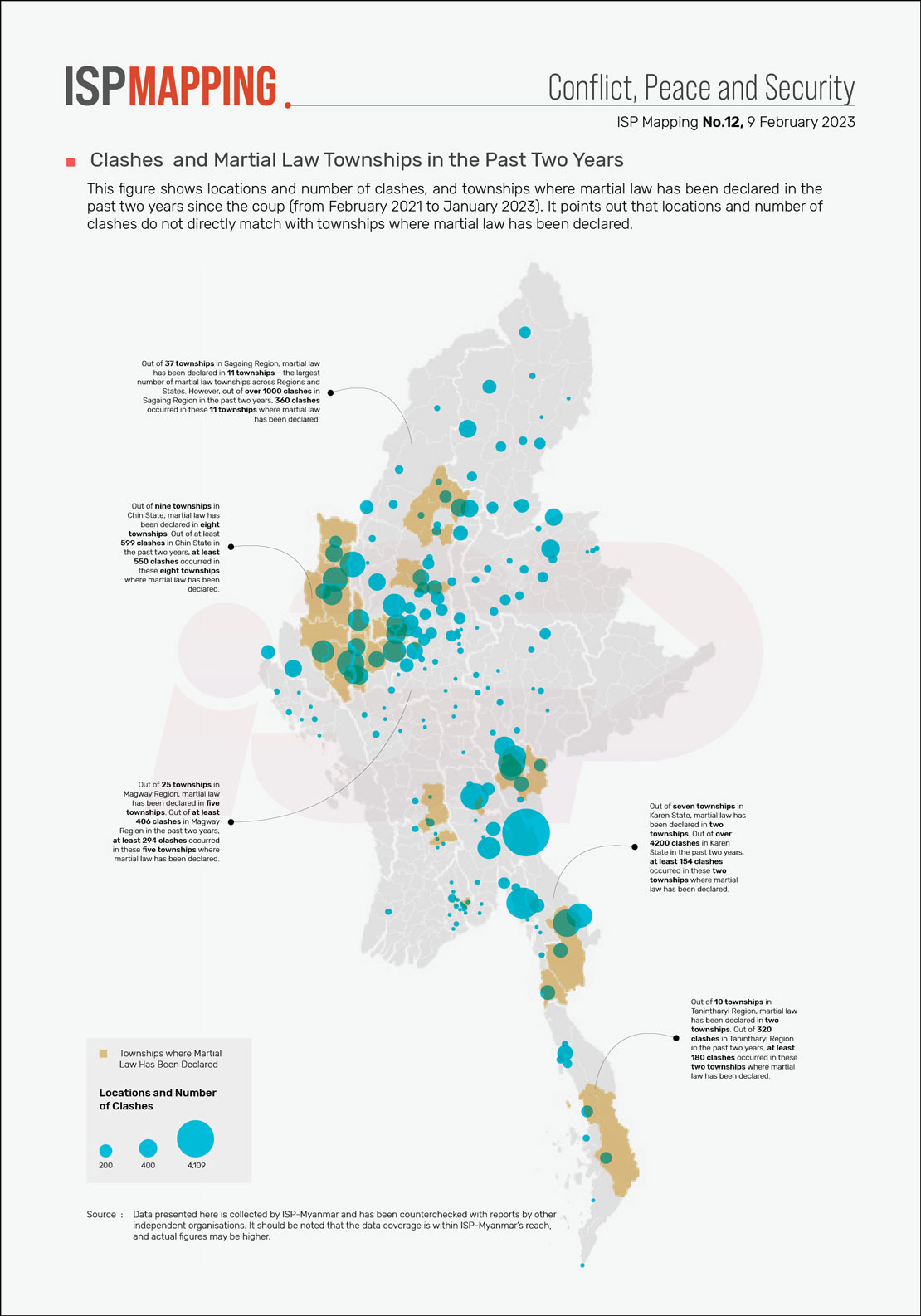This figure shows locations and number of clashes, and townships where martial law has been declared in the past two years since the coup (from February 2021 to January 2023). It points out that locations and number of clashes do not directly match with townships where martial law has been declared.