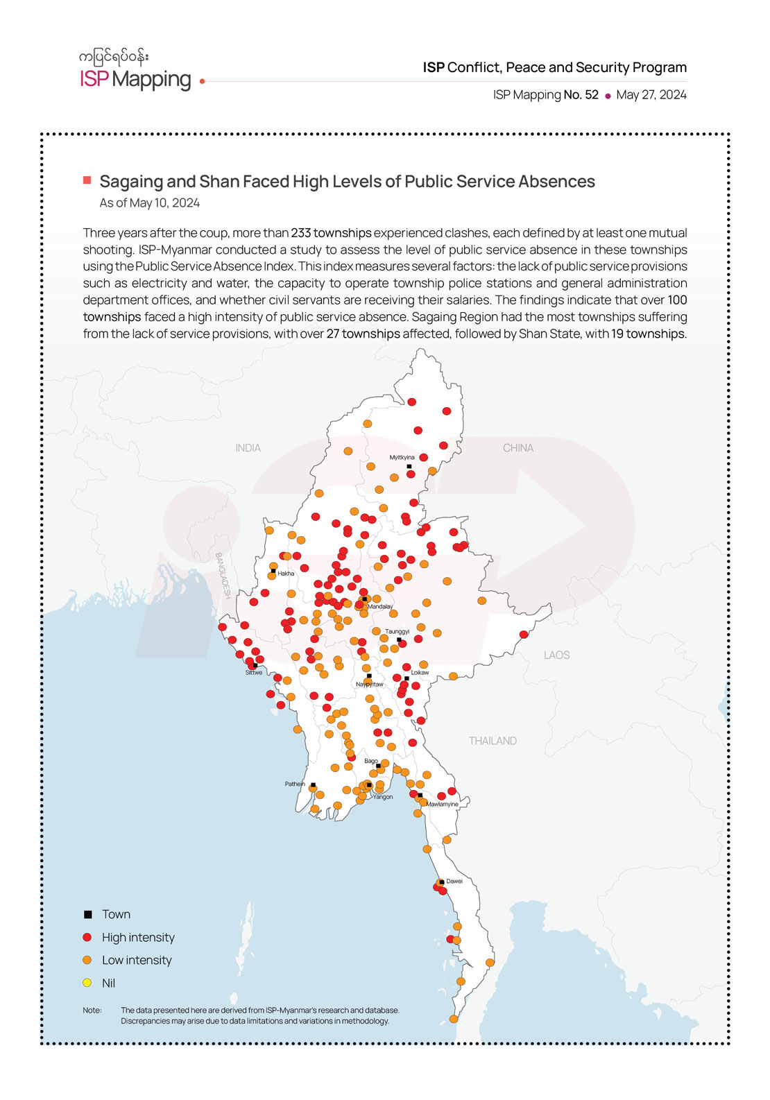 Three years after the coup, more than 233 townships experienced clashes, each defined by at least one mutual shooting. ISP-Myanmar conducted a study to assess the level of public service absence in these townships using the Public Service Absence Index. This index measures several factors: the lack of public service provisions such as electricity and water, the capacity to operate township police stations and general administration department offices, and whether civil servants are receiving their salaries. The findings indicate that over 100 townships faced a high intensity of public service absence. Sagaing Region had the most townships suffering from the lack of service provisions, with over 27 townships affected, followed by Shan State, with 19 townships.