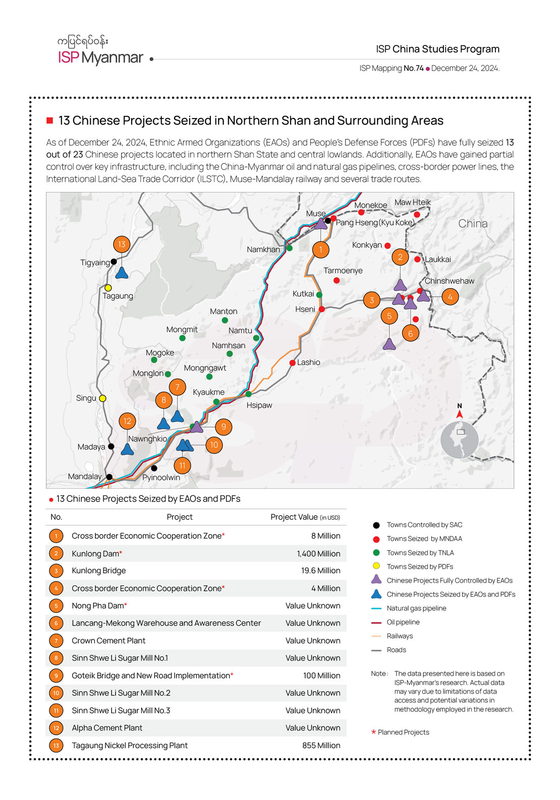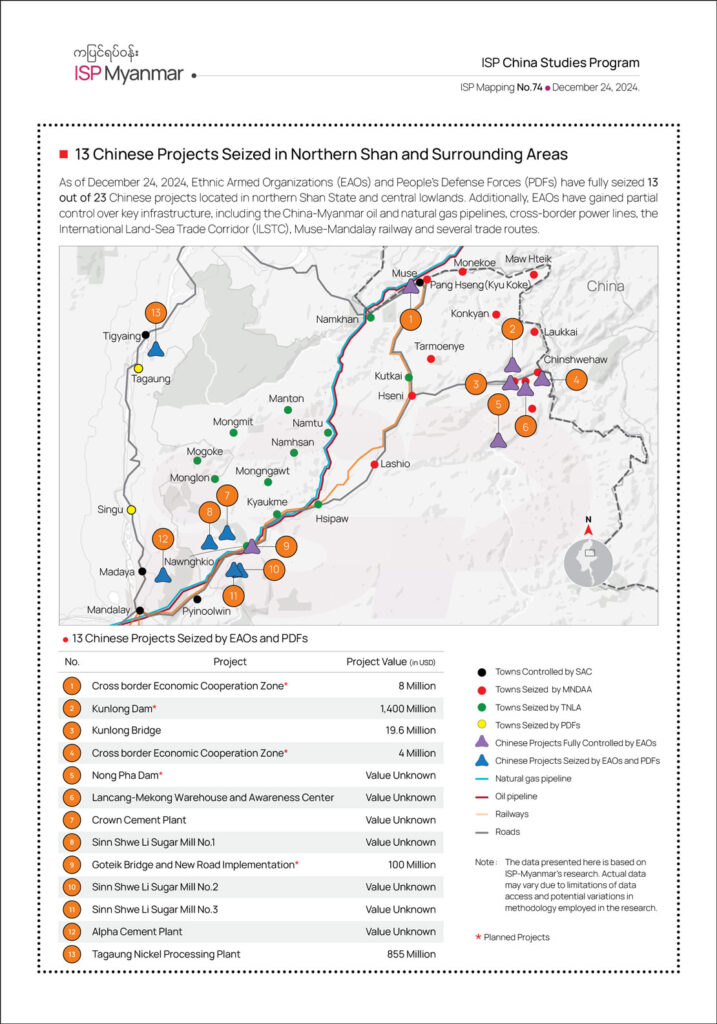 As of December 24, 2024, Ethnic Armed Organizations (EAOs) and People’s Defense Forces (PDFs) have fully seized 13 out of 23 Chinese projects located in northern Shan State and central lowlands. Additionally, EAOs have gained partial control over key infrastructure, including the China-Myanmar oil and natural gas pipelines, cross-border power lines, the International Land-Sea Trade Corridor (ILSTC), Muse-Mandalay railway and several trade routes.