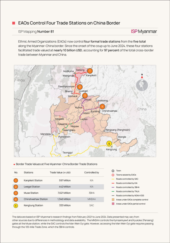 Ethnic Armed Organizations (EAOs) now control four formal trade stations from the five total along the Myanmar-China border. Since the onset of the coup up to June 2024, these four stations facilitated trade valued at nearly 10 billion USD, accounting for 97 percent of the total cross-border trade between Myanmar and China.