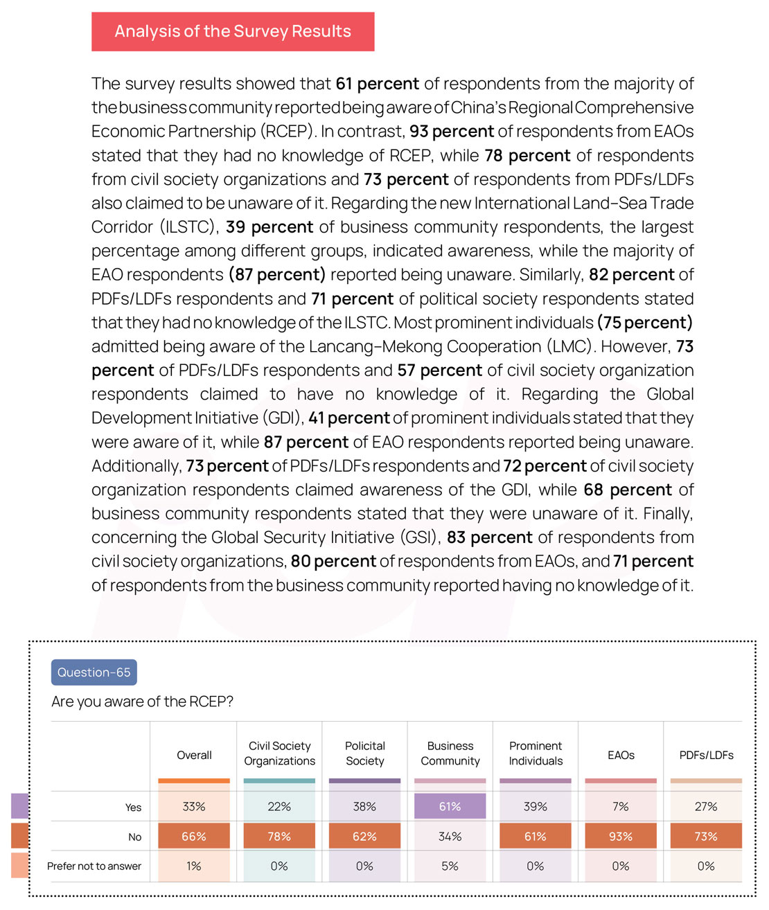 This section presents the findings of key stakeholders’ perceptions of several critical questions such as: What is the awareness of China’s regional integration projects? What are the Global Security Initiative’s (GSI) potential impacts on Myanmar’s Security sector? How effective is the cooperation on the crackdown of transnational organized crimes (TOCs)? and other important questions.