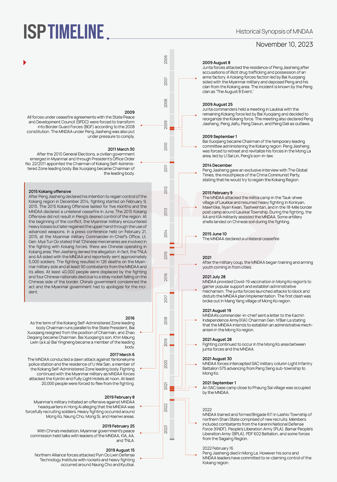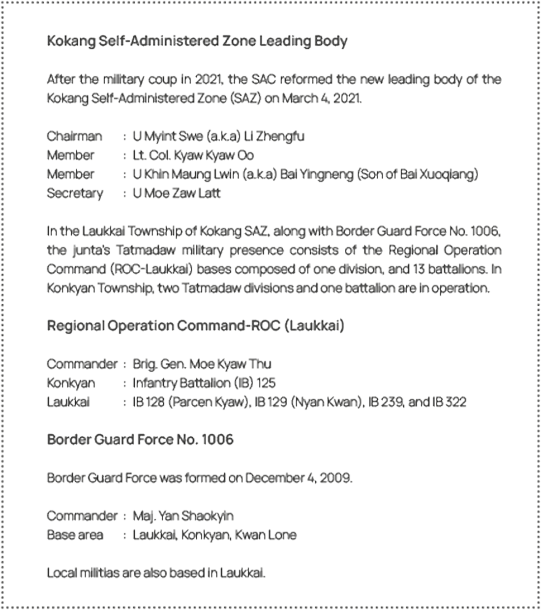 For background information on the Kokang Self-Administered Zone (SAZ), covering topics such as Kokang’s inclusion into Myanmar territory, the Peng family, Yang family, Pe family, and the Kokang army in the past, as well as the modern-era MNDAA (Myanmar Democratic Alliance Army), please visit the ISP Gabyin Community.