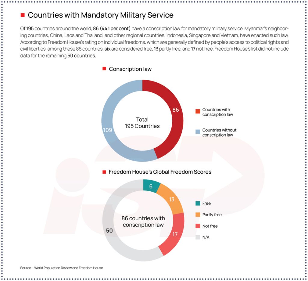 The State Administration Council (SAC) declared the enforcement of “the People’s Military Service Law”*, which is commonly known as the conscription law, on February 10, 2024, which requires all male citizens aged 18 to 35 and all female citizens aged 18 to 27 to perform mandatory military service in the junta armed forces. Despite the absence of active warfare with other nations, in light of the junta’s unprecedented losses amid post-coup conflict, the declaration of this conscription law has fueled panic among the country’s 14 million youth and their families.