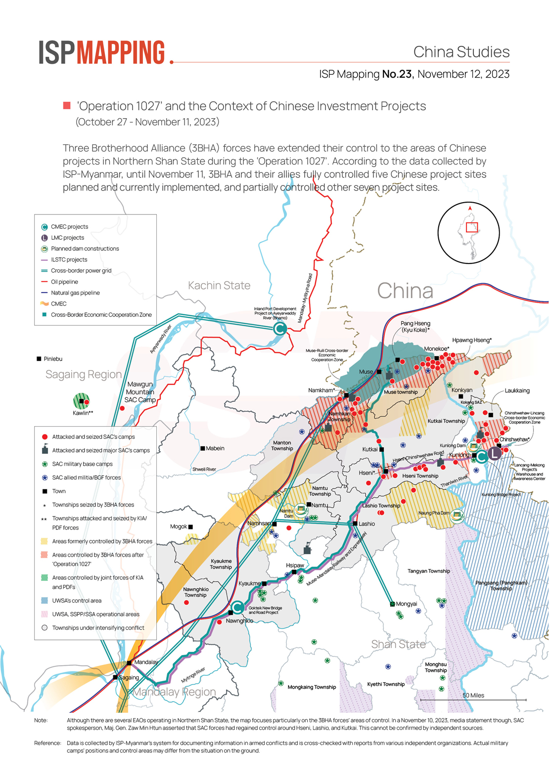 Three Brotherhood Alliance (3BHA) forces have extended their control to the areas of Chinese projects in Northern Shan State during the ‘Operation 1027’. According to the data collected by ISP-Myanmar, until November 11, 3BHA and their allies fully controlled five Chinese project sites planned and currently implemented, and partially controlled other seven project sites.
