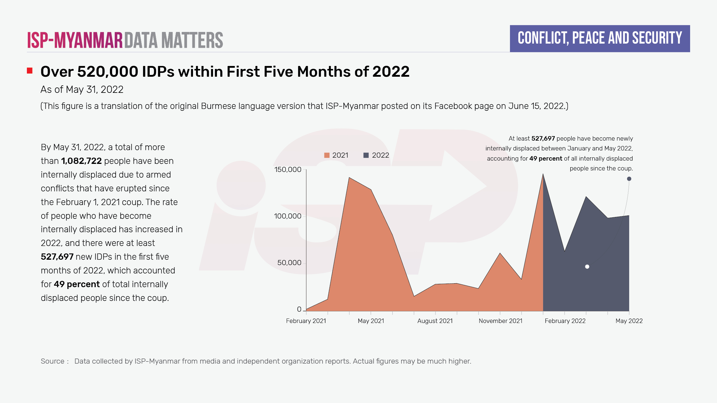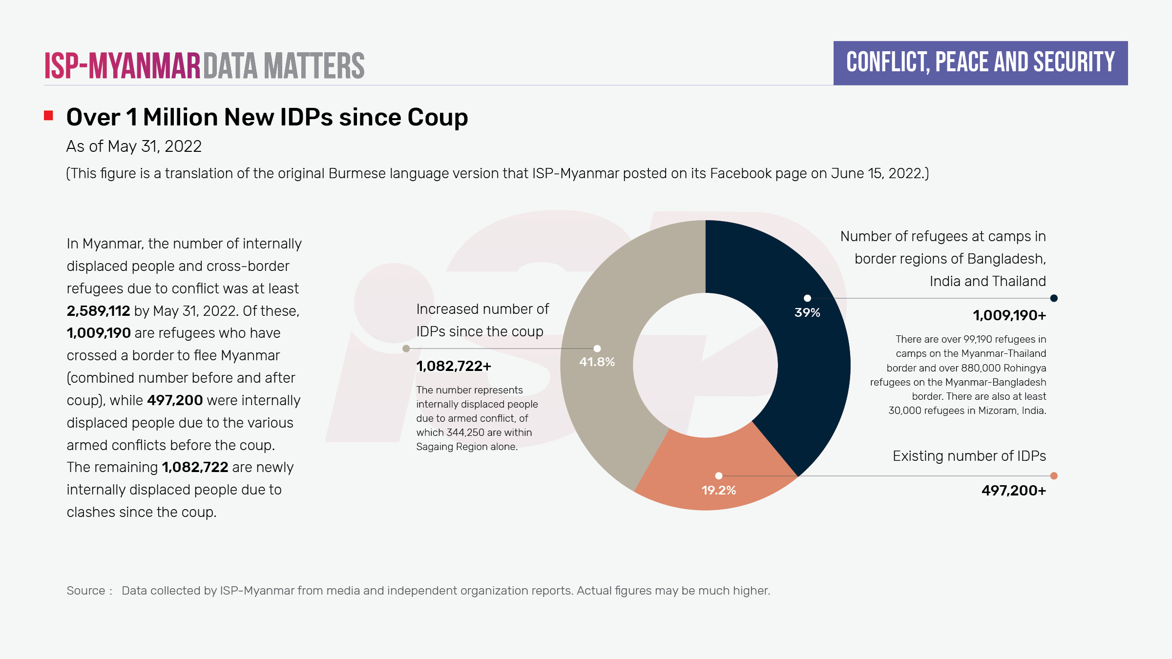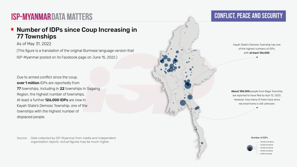 In Myanmar, the combined number of internally displaced people and refugees having crossed a border due to conflict from 1989 to May 31, 2022 has exceeded 2.5 million (2,589,112). Of these, 1,009,190 (combined before and after the coup) are refugees who have fled the country and 497,200 are people internally displaced due to the various armed conflicts before the coup. The rest 1,082,722 represents the number of new IDPs increased since the coup on February 1, 2021 until May 31, 2022 due to clashes between State Administration Council (SAC) forces with both ethnic armed organizations and other local defense forces (such as the PDF/LDF/CDF/CNDF/KNDF).