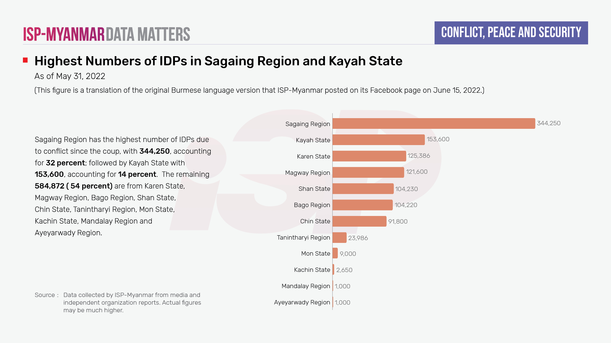 The number of refugees has been increasing monthly since the coup, and at least 527,697 people have now become internally displaced in the first five months to May of 2022. This represents 49 percent of the total number of newly internally displaced people since the coup. Sagaing Region now has the highest number of IDPs since the coup with 344,250, accounting for 32 percent of the total; this is followed by Kayah State with 153,600, accounting for 14 percent. The remaining 584,872 (54 percent) are from Karen State, Magway Region, Bago Region, Shan State, Chin State, Tanintharyi Region, Mon State, Kachin State, Mandalay Region and Ayeyarwady Region.