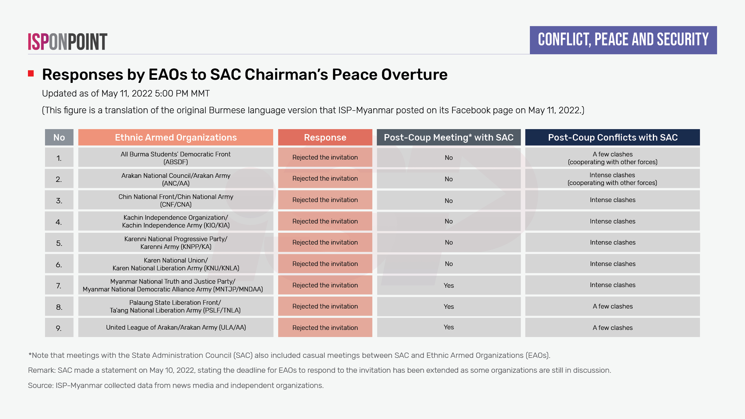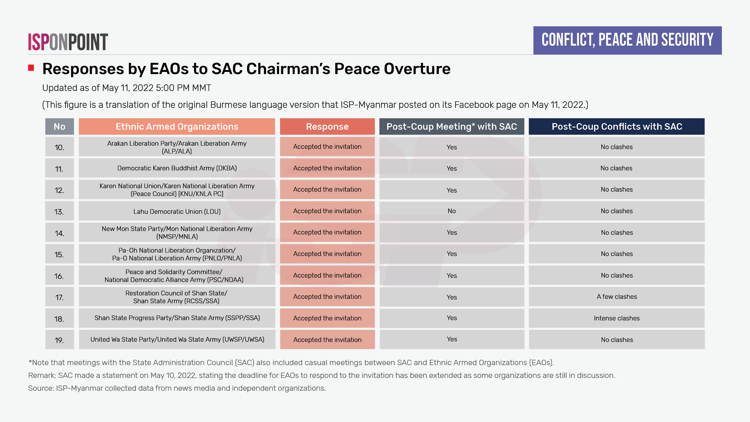 Sr. Gen. Min Aung Hlaing, Chairman of the State Administration Council (SAC), personally invited the heads of Ethnic Armed Organizations (EAOs) to talk about peace on April 22, 2022. As of May 9, the deadline to respond to the offer, only 10 out of 21 EAOs answered the call to meet.