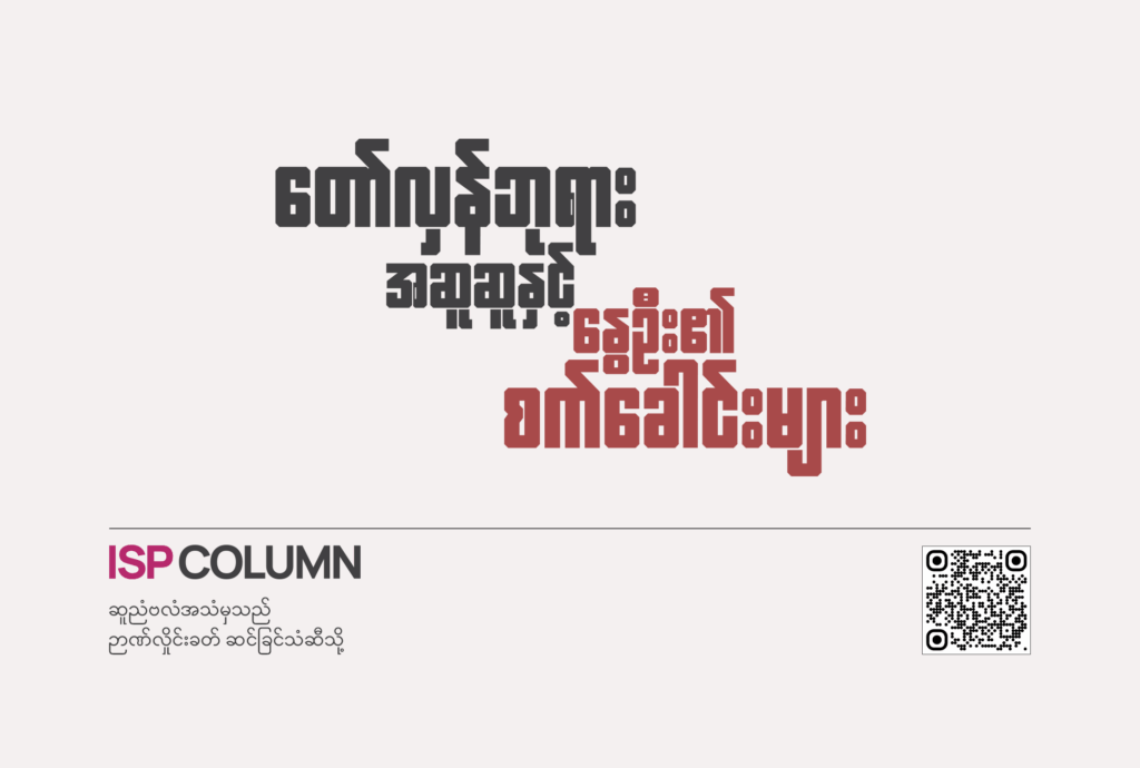 27 Nov 2025 သိမ်းပိုက်ခံမြို့ထဲက မြေစာမြက်များ စစ်ပွဲအတွင်း အရပ်သားများကိုကာကွယ်ရေးအတွက် နိုင်ငံတကာဥပဒေများရှိကြောင်း မြို့ထဲမှာ ဟိုစပ်စပ်ဒီစပ်စပ်ပါတတ်သည့် လူငယ်တချို့ထံကနေ ကြားဖူးနားဝရှိဖူးသည်။ ထိုစကားကိုကြားစက ပြောနေကြသူ လူငယ်ကလေးများ၏ မျက်လုံးများကို သူ ကိုယ်တိုင်ကိုယ်ကျ လက်ဖြင့်ဖြဲကာ မေးလိုက်ချင်သည်။ မည်သူက မည်သူ့ကို ကာကွယ်နေသည်ကို တွေ့သနည်းဟူ၍။