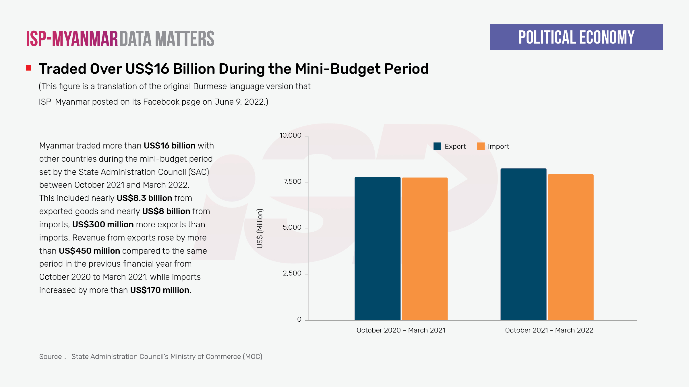 Myanmar’s foreign trade topped US$16 billion during the first mini-budget period set by the State Administration Council (SAC). Exports accounted for nearly US$8.3 billion, while imports added nearly US$8 billion. Overall trade value declined in this period over the previous financial year by more than US$160 million. Trade with China during this period brought in more than US$4.2 billion, a drop of more than US$1.3 billion for the same period last year.